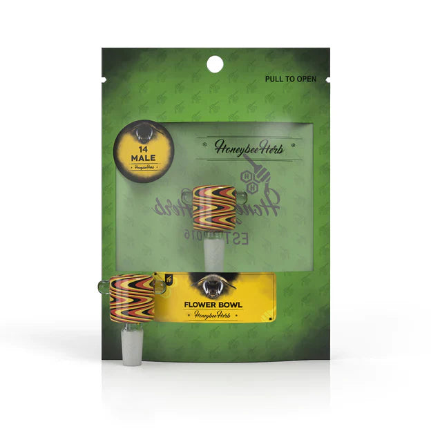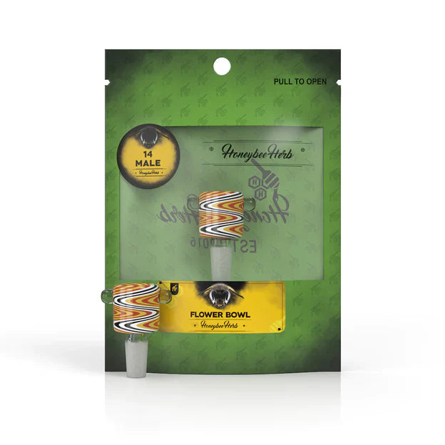 The Honeybee Herb Glass Flower Bowl comes in at a Length of 2.5" and is made Durable glass. The Bowl is made for 14 mm female joints.