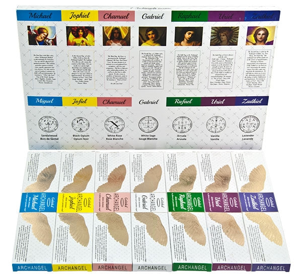 The Goloka Seven Archangel Essential Oil Blend Gift Pack is a spiritually inspired aromatherapy set created to invoke the blessings and guidance of the seven Archangels. Each incense pack corresponds to a celestial guardian, crafted with natural botanicals chosen to embody their sacred qualities of protection, healing, love, clarity, and wisdom.