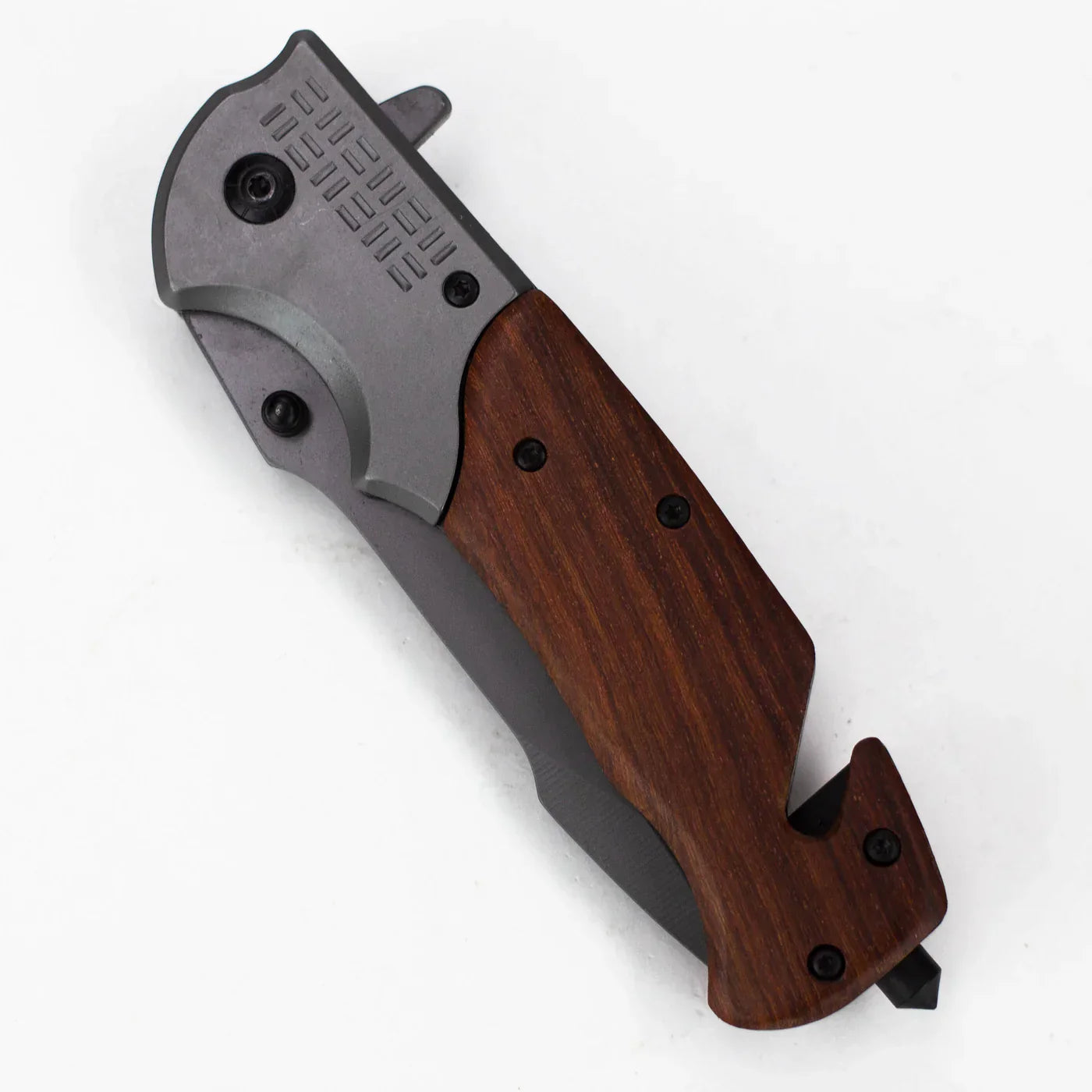 The ALPHASTEEL - 9" Folding Pocket Knife - Redwood blends rugged utility with a classic wooden aesthetic. Designed for functionality, it features a 3.5" Tanto serrated blade, an ergonomic wood-covered handle, and essential emergency tools like a glass breaker and belt cutter. Ideal for everyday use or outdoor needs, this folding knife offers both performance and style.