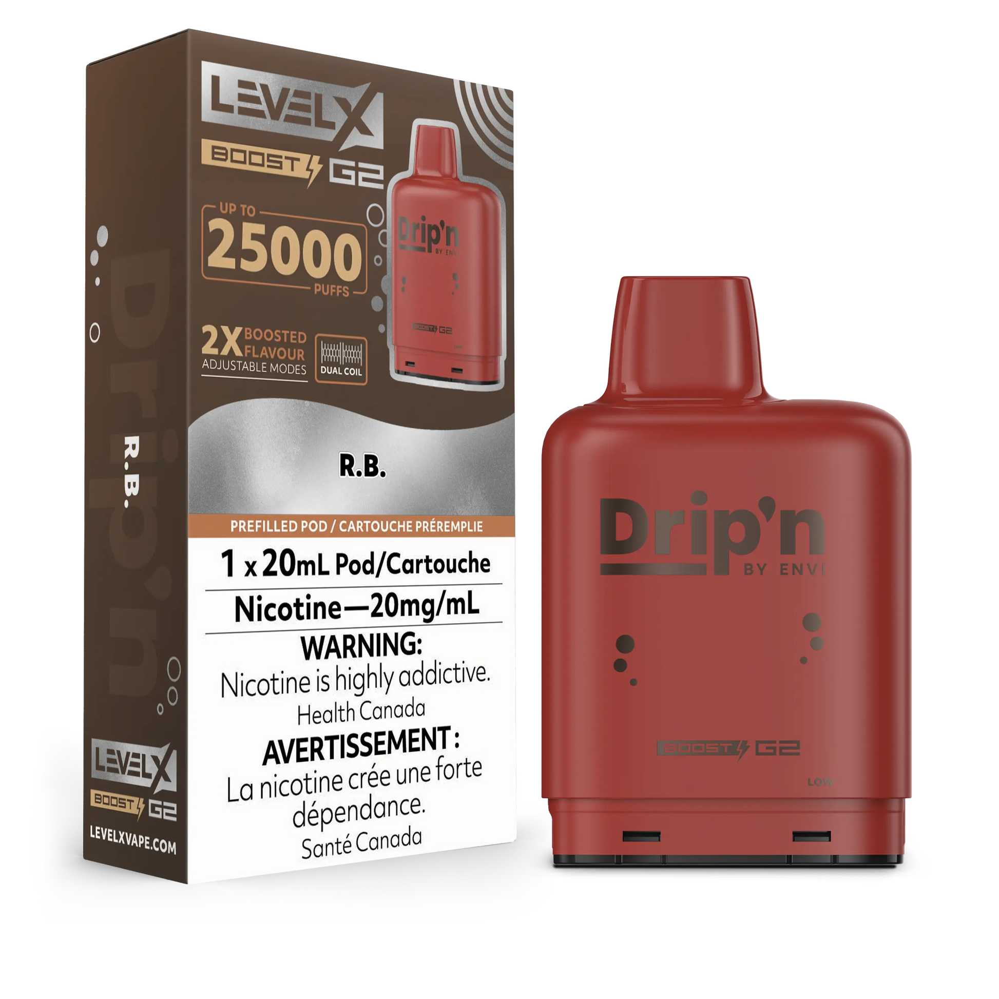 The Drip'n Level X G2 Boost Replacement Pod, is powered by the level X device battery. Holding 20 mL of 20 mg salt nicotine Drip'n e-Juice in a prefilled pod it is rated for 25,000 puffs in eco mode. LVL X Envi G2 Boost 25K uses a 1.0ohm mesh coil in Standard mode and 0.5ohm dual mesh coil in Boost mode. Each pod is rated up to 25000 puffs. The pods are compatible with all level X batteries but can only use boost mode with the Level X Boost or G2 Device Kit. They will only display digital e-liquid and battery level with the G2 battery as well as function in 3 modes economy, normal and boost modes.
