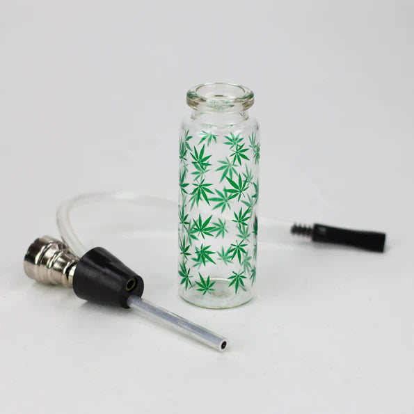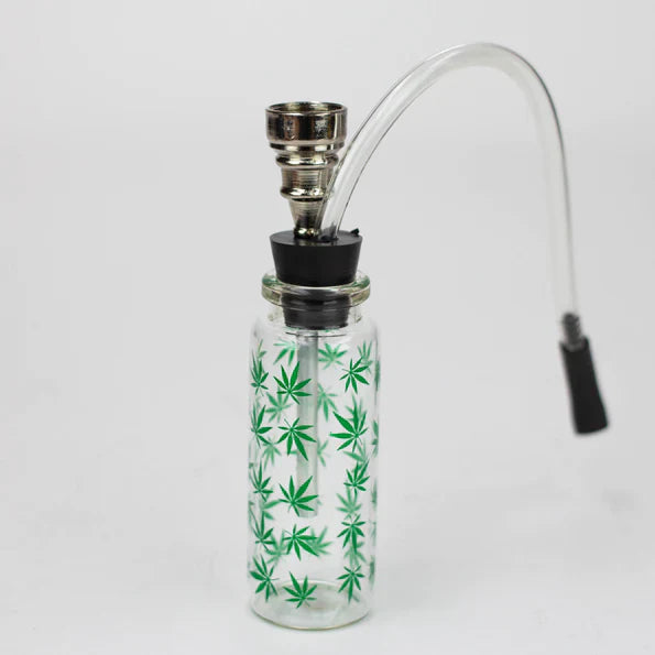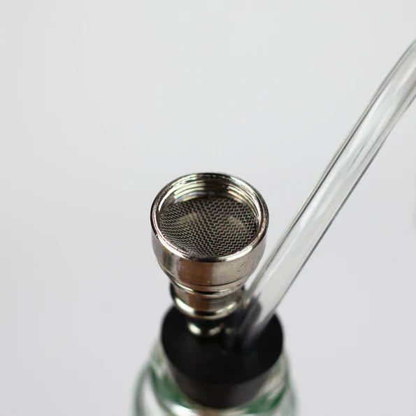 This 4" mini glass water pipe hits hard. Don't let the size fool you. It smokes as nicely as it fits in the hand. Comes with This small glass Bottle Bong is with the glass bowl and hose threaded through the rubber. The Bowl and mouthpiece is removable. Base holds a nice amount of water. Nice portable bong.