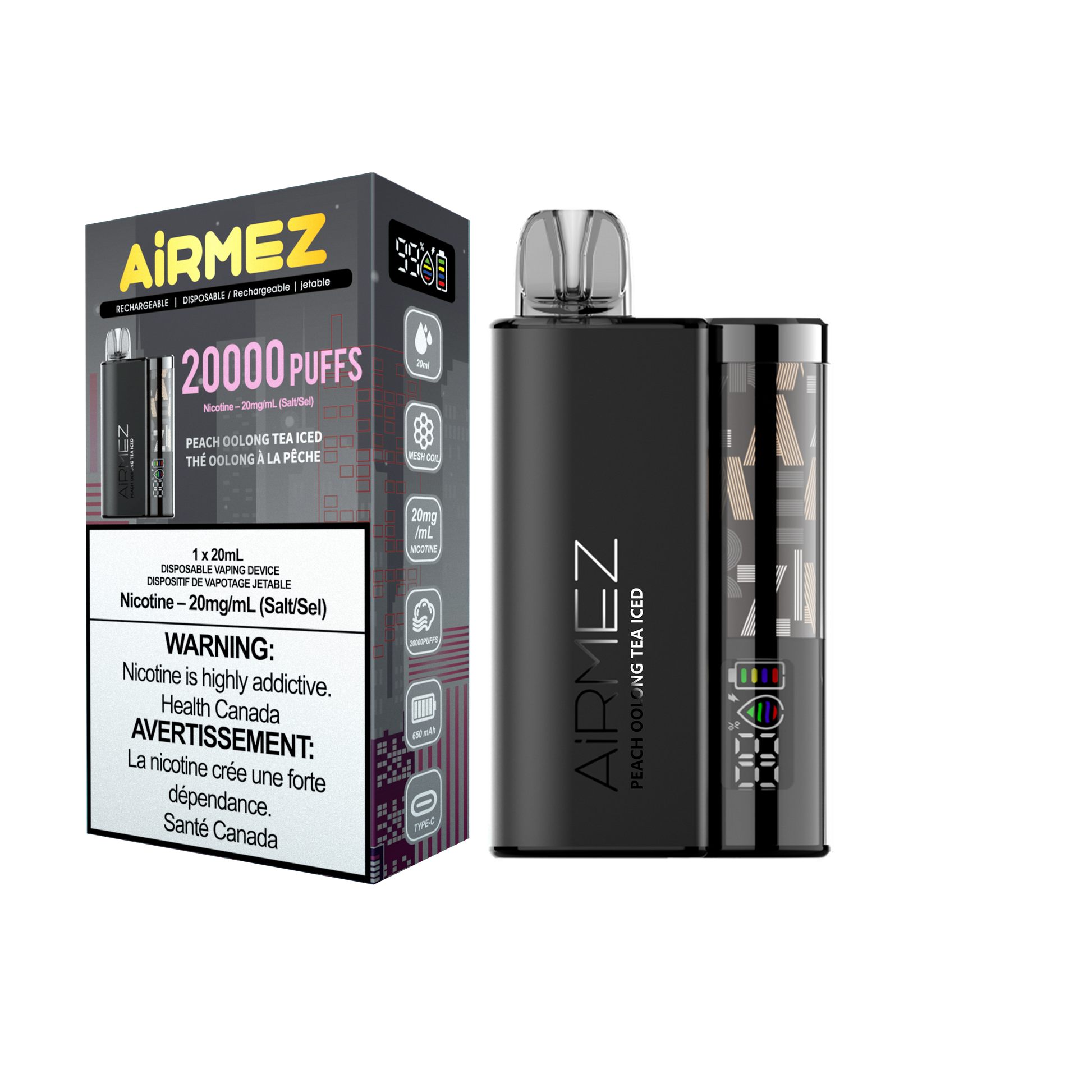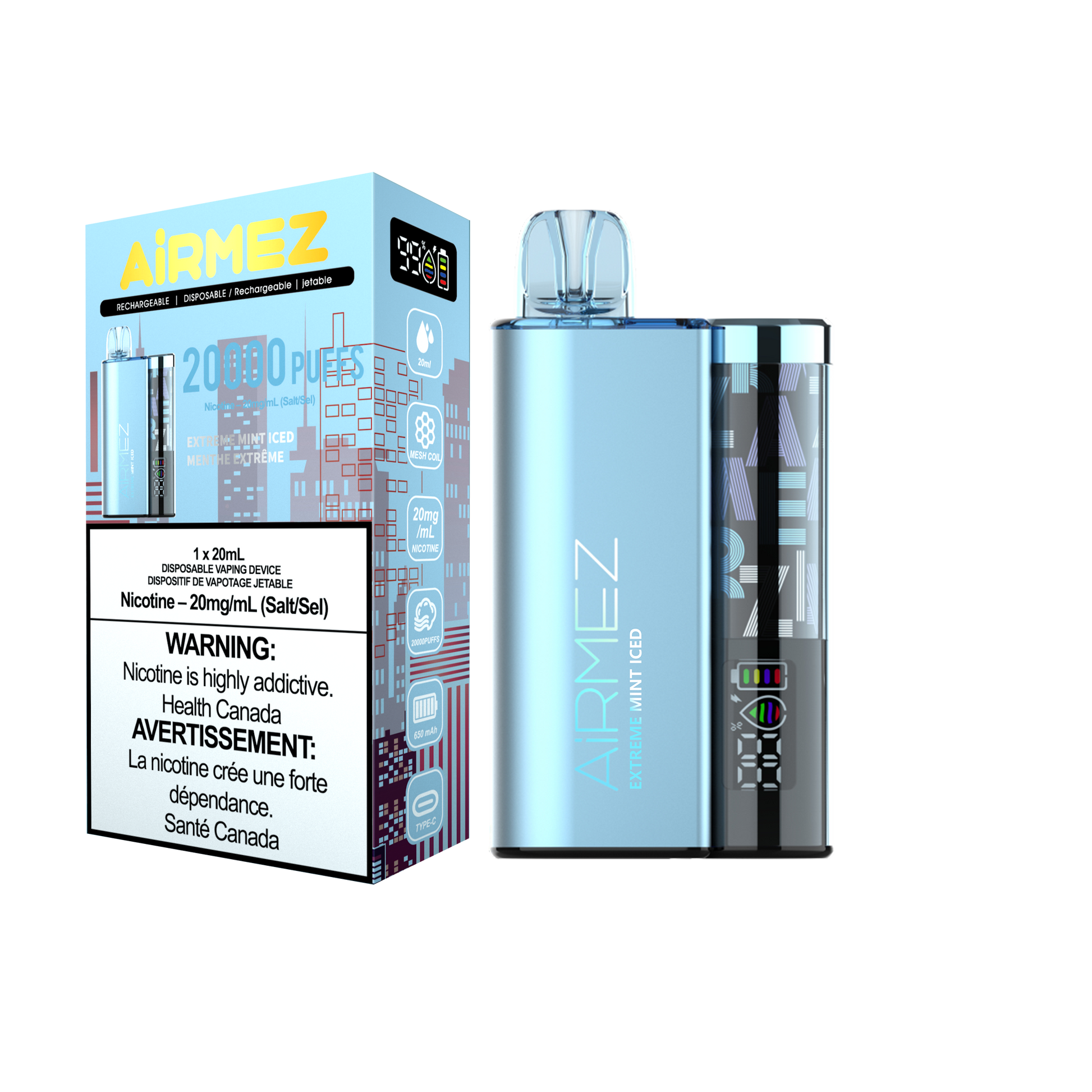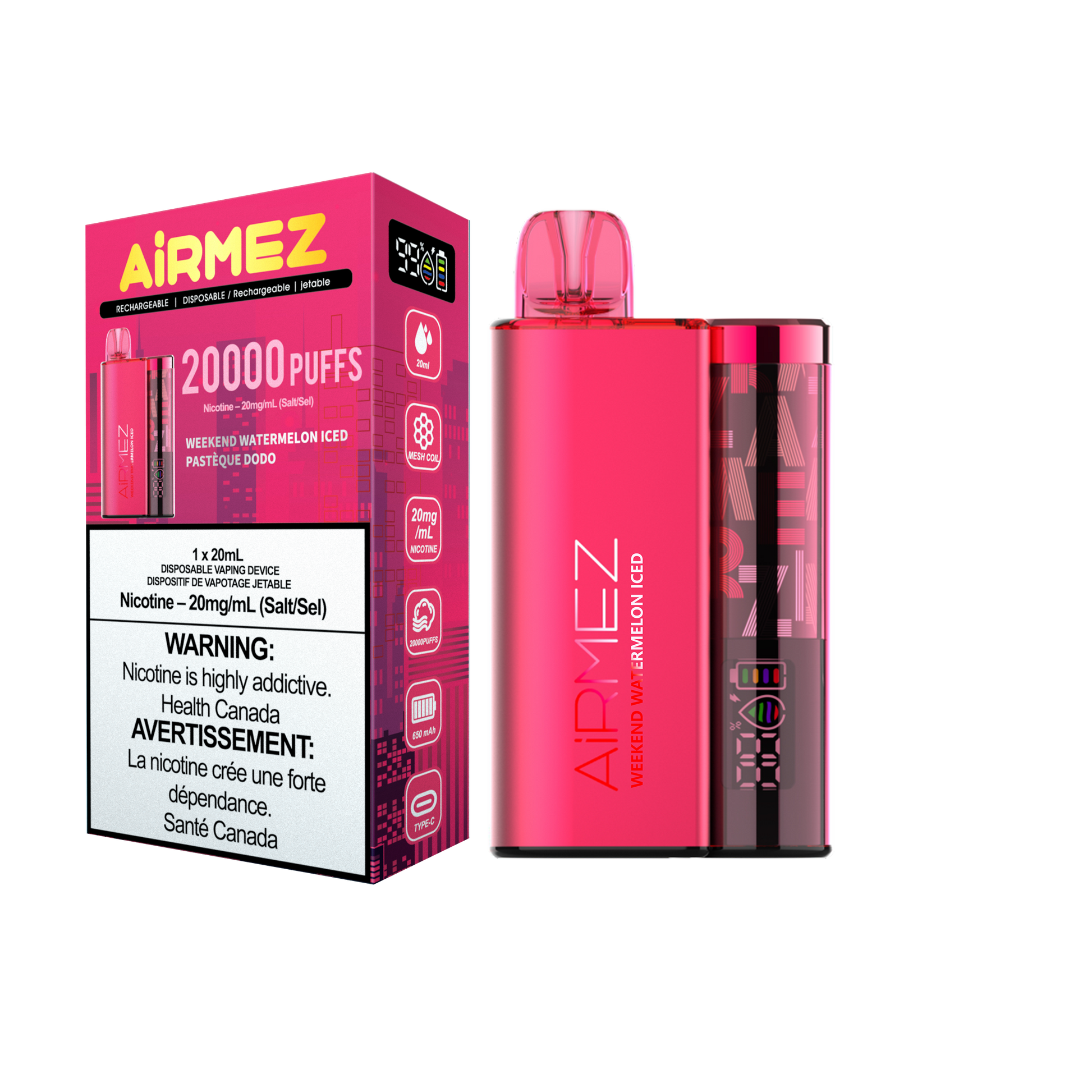 The Airmez 20K Disposable Vape is rated up to 20,000 puff. This vape is pre-filled with 20mL of 20 mg/mL ultra icy nicotine salt E-Liquid and is equipped with a mesh coil for enhanced flavour. The Airmez has a digital screen showing battery and E-Juice levels.