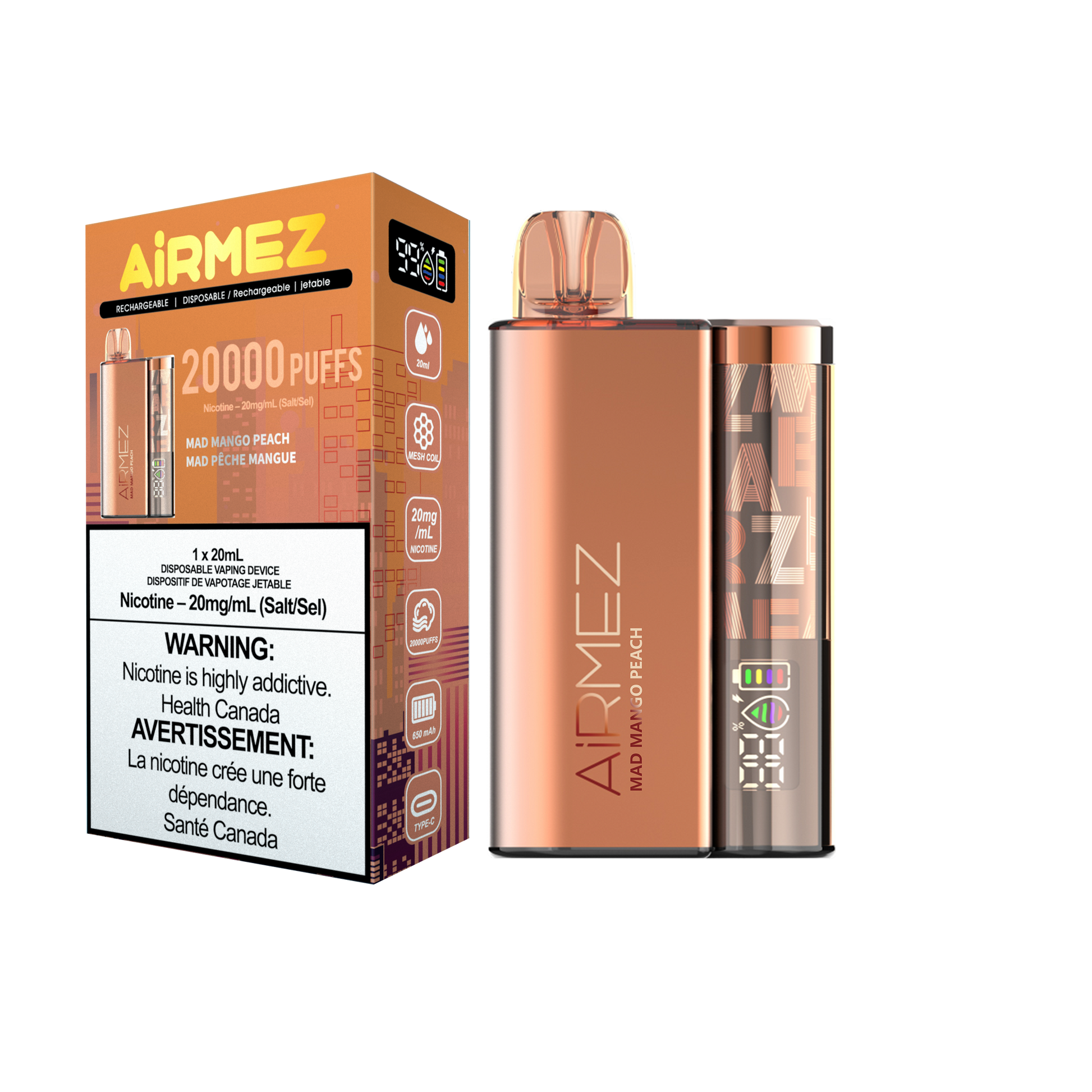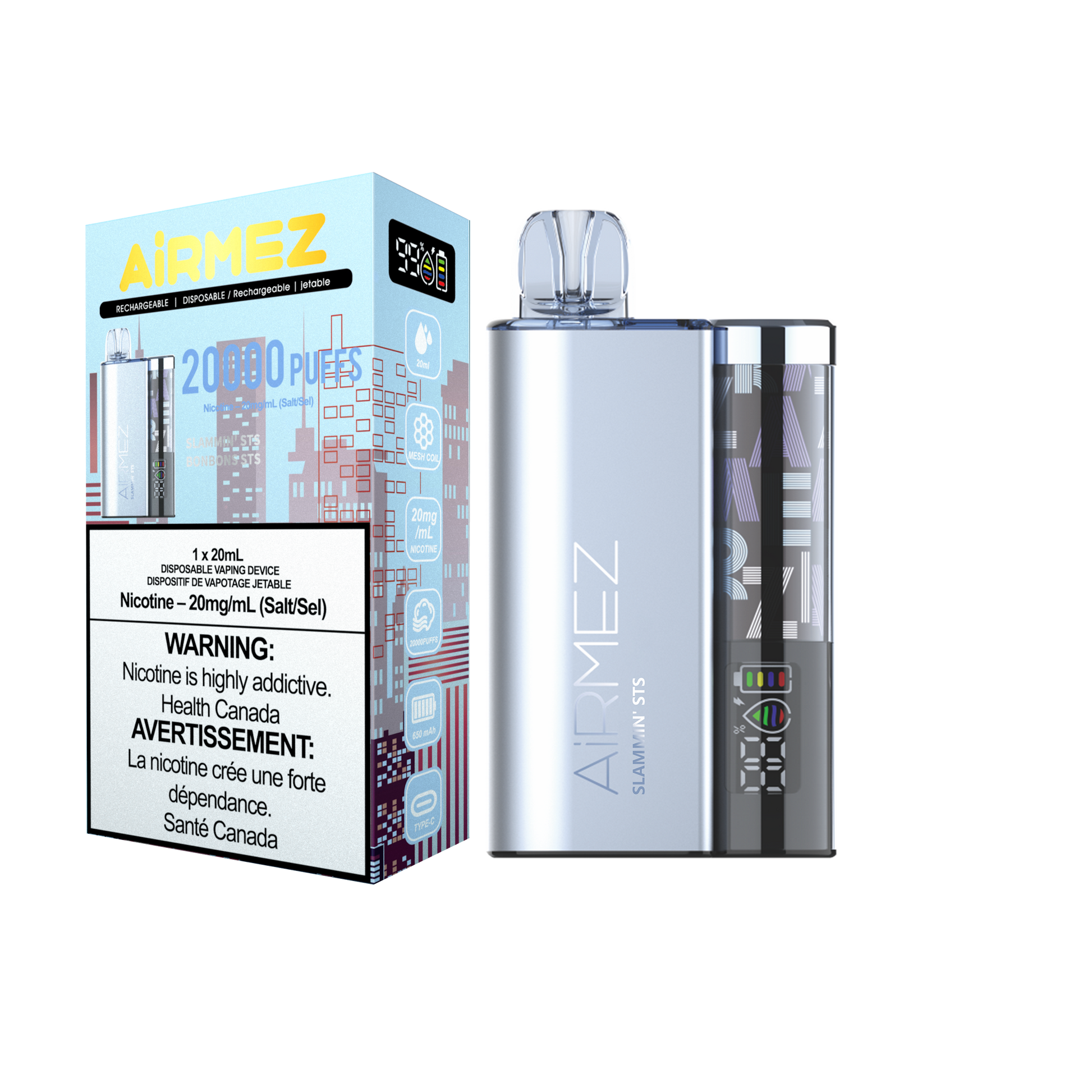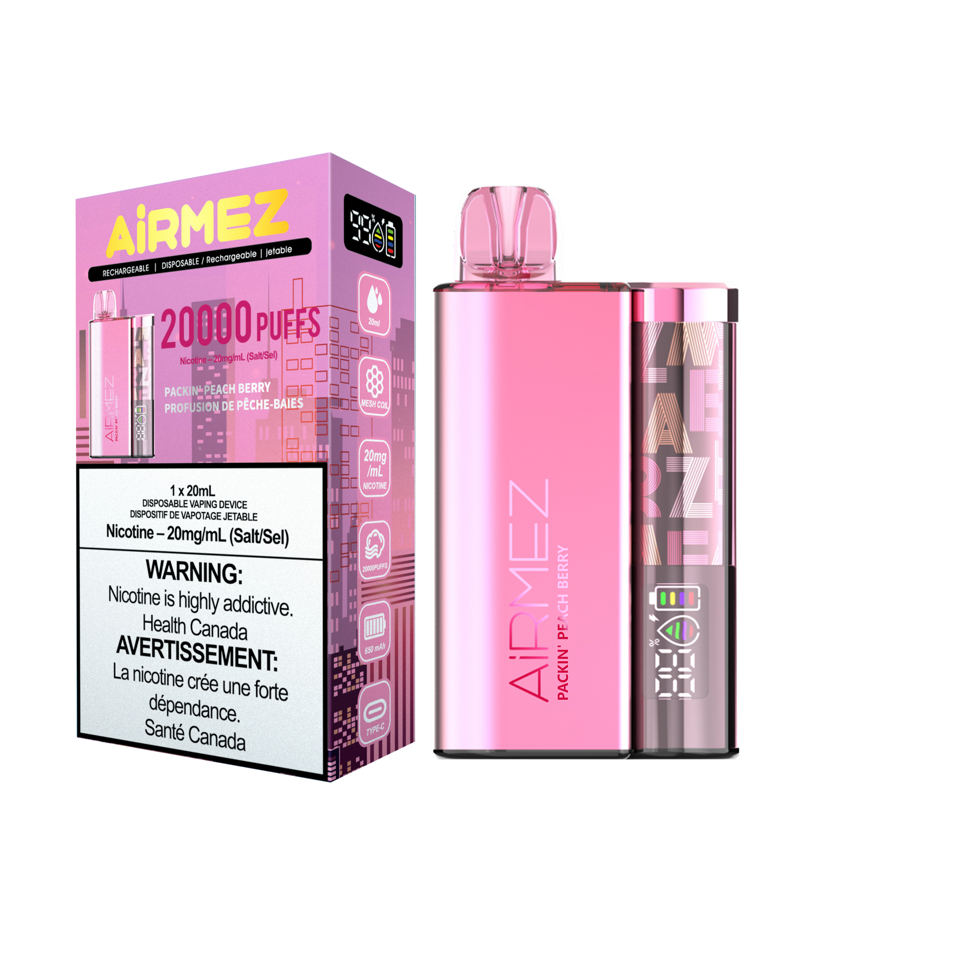 The Airmez 20K Disposable Vape is rated up to 20,000 puff. This vape is pre-filled with 20mL of 20 mg/mL ultra icy nicotine salt E-Liquid and is equipped with a mesh coil for enhanced flavour. The Airmez has a digital screen showing battery and E-Juice levels.