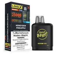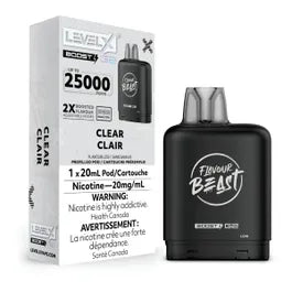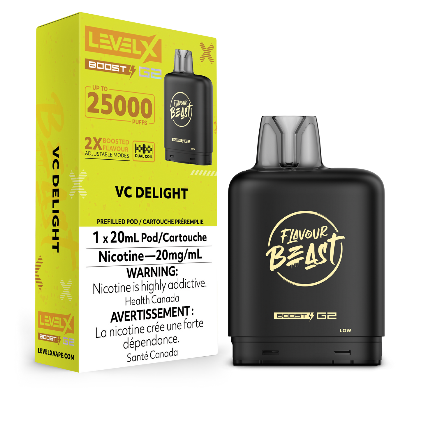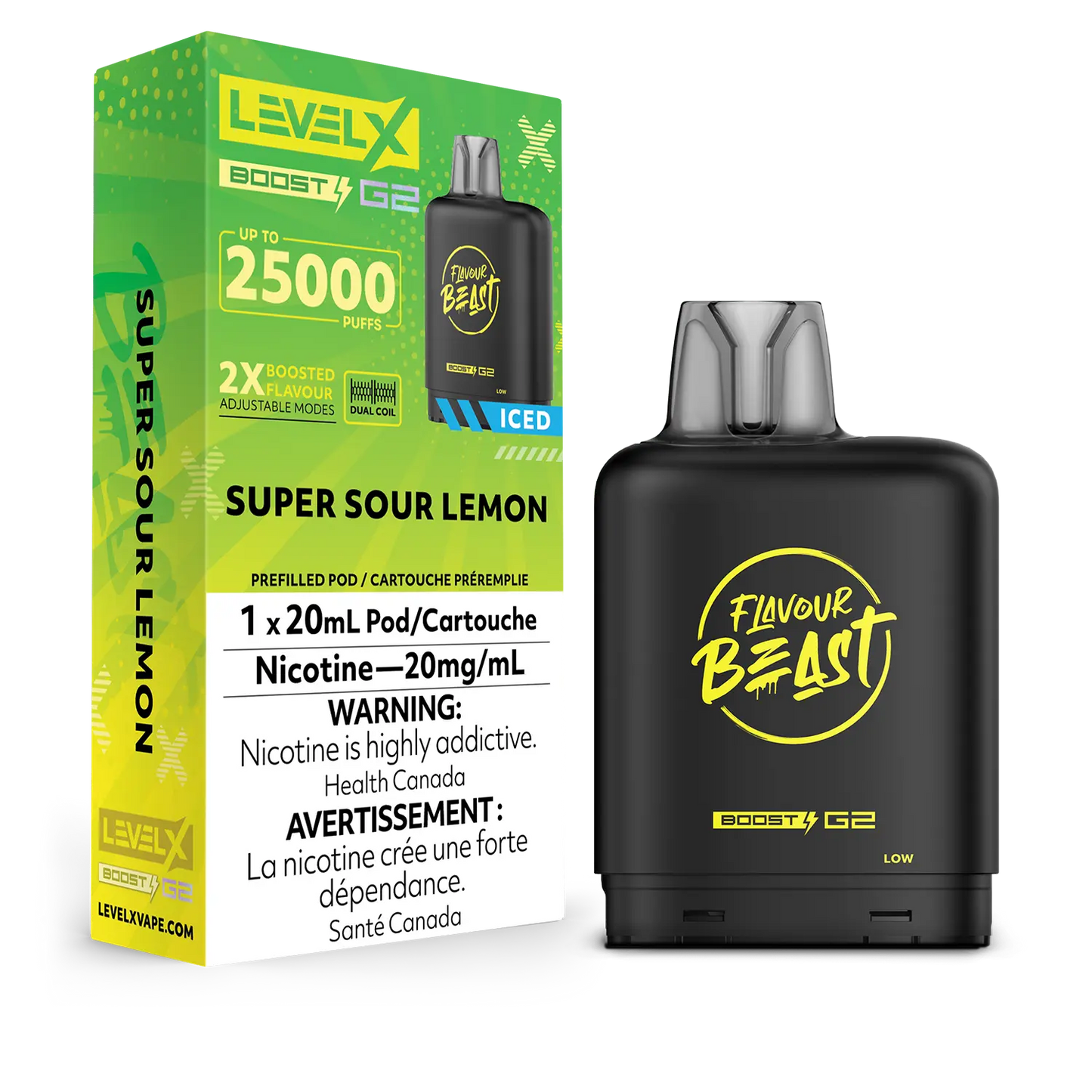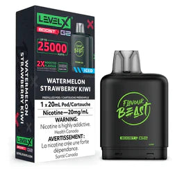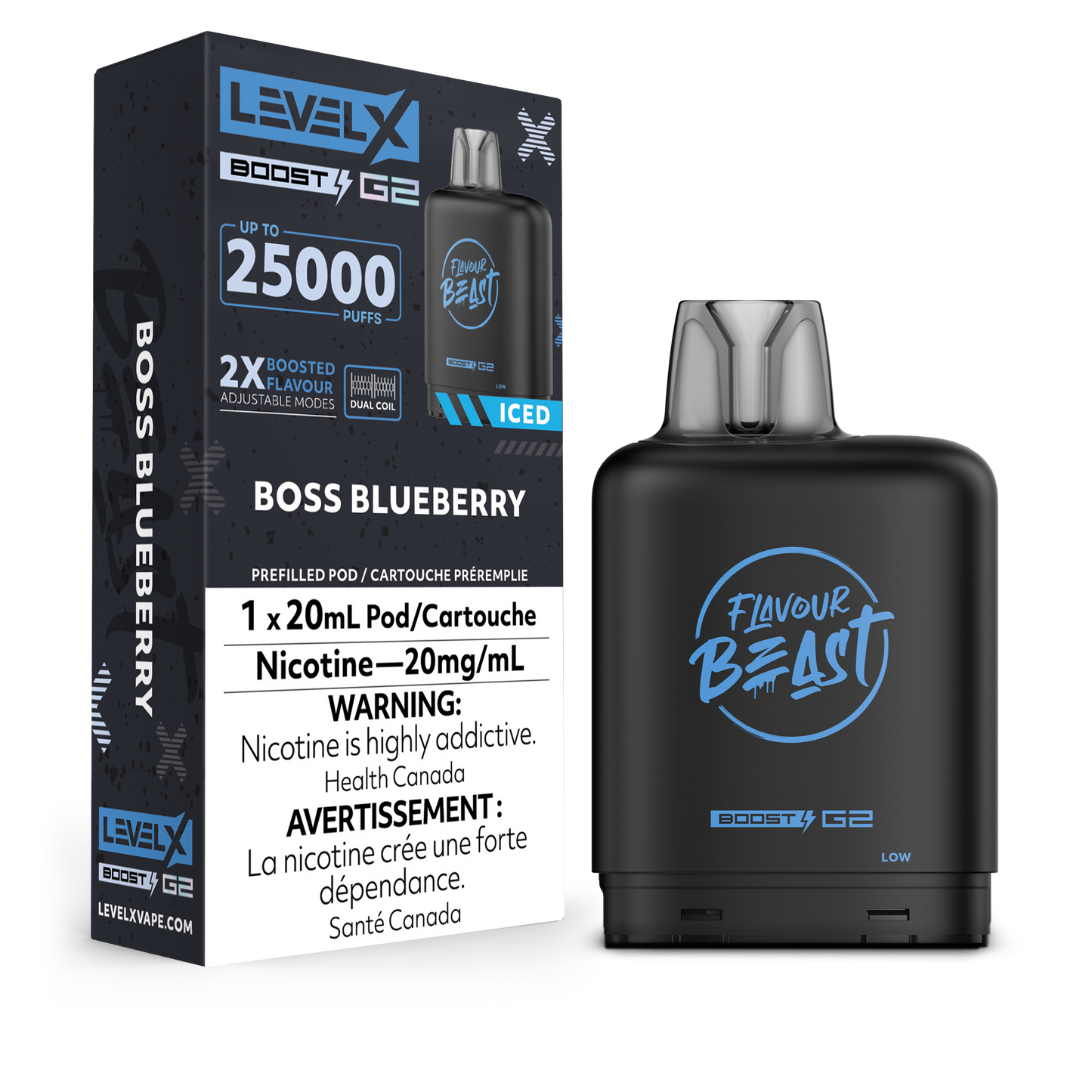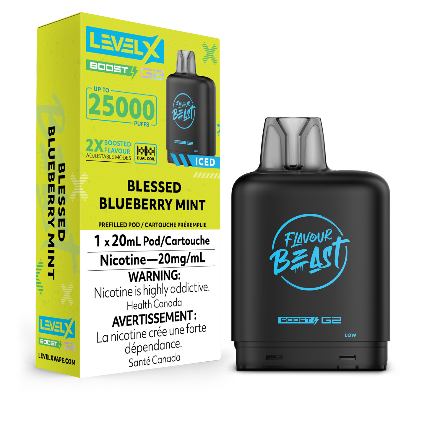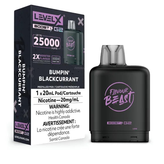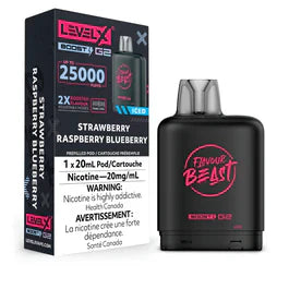 The Flavor Beast Level X G2 Boost Replacement Pod, is powered by the level X device battery. Holding 20 mL of 20 mg salt nicotine Flavour Beast E-Juice in a prefilled pod it is rated for 25,000 puffs in eco mode. LVL X FB G2 Boost 25K uses a 1.0ohm mesh coil in Standard mode and 0.5ohm dual mesh coil in Boost mode. Each pod is rated up to 25000 puffs. The pods are compatible with all level X batteries but can only use boost mode with the Level X Boost or G2 Device Kit. They will only display digital e-liquid and battery level with the G2 battery as well as function in 3 modes economy, normal and boost modes.