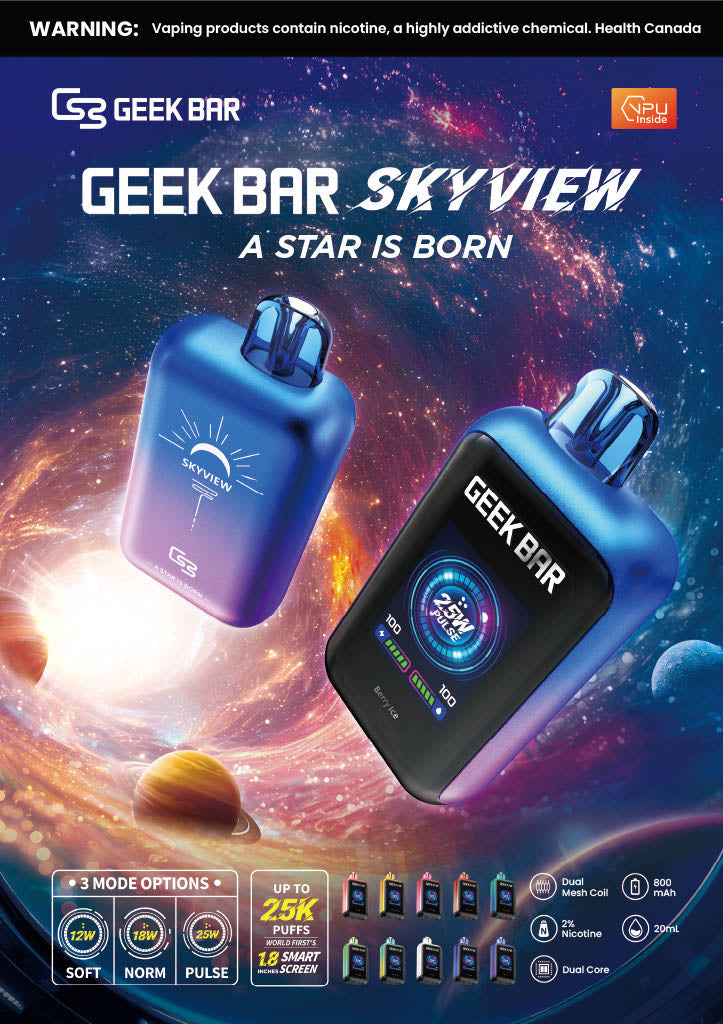 The Geek Bar Skyview 25000 Puff Disposable Vape 20ml takes only 20 minutes to charge the 800mAh battery from 0% to 80%, so you will have less down time charging. Also with just one click on the bottom of the Skyview device, you can adjust the power from soft mode 12w, Normal mode 18w, and Pulse mode 25w. This GeekBar comes prefilled with 20mL of 20mg/mL of nicotine salt e-juice, The Geek Bar Skyview also has 5 UI design interfaces with its 1.8 inch screen showing power regulation and charging progress.