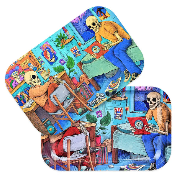 These Grateful Dead x Pulsar - Rolling Tray with Lid - Roomies Combos are perfect for protecting herb and smoking gear from chaos and debris, and they feature a matching officially licensed Roomies cover art design with a pair of skeletal roommates bonding over a love of music and surrounded by subtle musical references. These lightweight metal rolling trays have raised edges to contain all loose herb and assist with rolling. The matching lid fits securely on top of the tray and magnetically attaches to the edges to protect all contents. Both tray and lid measure 11" x 7".